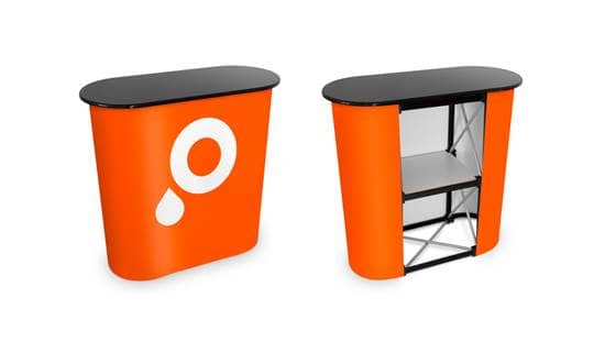 Cornered pop-up counter, textile banner, open on the back with shelf