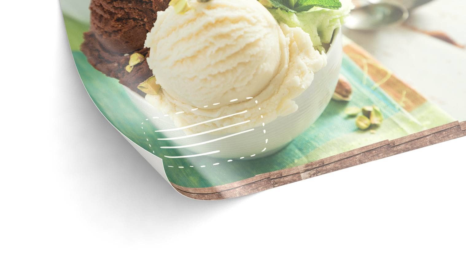 Our ice cream menus are printed on 230g/m² synthetic paper. This is a coated paper, so not only is it wipeable, it also renders brilliant images. The paper is particularly durable, water-resistant and tear-proof. So it's the ideal material for ice cream menus, because even careless children's hands won't damage this paper.